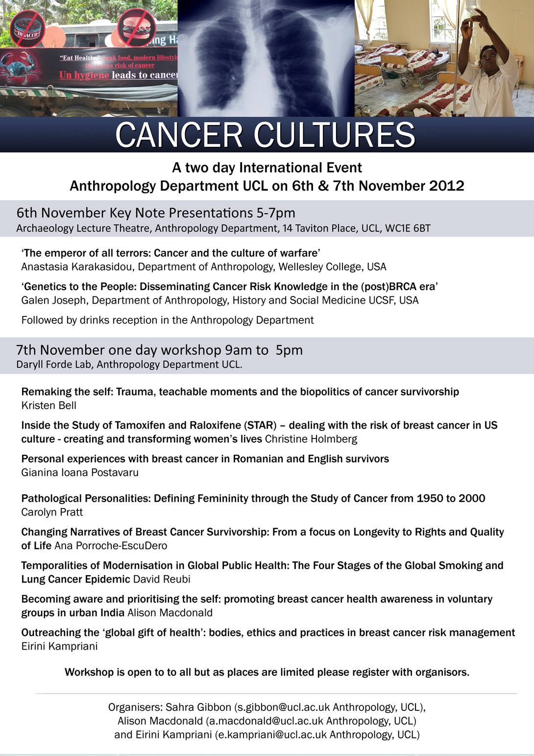 This event will bring together academics and postgraduate research students from within anthropology and other social sciences to examine the scope of different disciplinary approaches as these relate to understanding the diverse experience of and cultural or social engagement with the illness and disease of cancer. It will examine the varied dimensions of ‘cancer cultures’ from a comparative and historical viewpoint as they are constituted at the level of individual experience, family, community and within or across different national contexts. Papers will examine two main themes; ‘The Hidden Politics of Cancer Survivorship and Research’ and ‘Cancer in Globalizing Contexts’ and will include the following