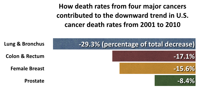 Of the 17 most common cancers in men, death rates declined for 11 of them (lung, prostate, colon and rectum, leukemia, NHL, esophagus, kidney, stomach, myeloma, oral, and larynx). Of the 18 most common cancers in women, there was a decline in the death rate for 15 of them (lung, breast, colon and rectum, ovary, leukemia, NHL, brain, myeloma, kidney, stomach, cervix, bladder, esophagus, oral, and gallbladder). Decreased rates of death for lung, colorectal, breast, and prostate cancers accounted for more than two-thirds of the overall reduction in cancer death rates from 2001 to 2010.