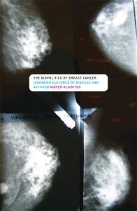 The Biopolitics of Breast Cancer: Changing Cultures of Disease and Activism by Maren Klawiter (University of Minnesota Press, 2008) – Maren Klawiter analyzes the breast cancer movement to show the broad social impact of how diseases come to be medically managed and publicly administered. Examining surgical procedures, early detection campaigns, and discourses of risk, Klawiter demonstrates that these practices initially inhibited, but later enabled, collective action. The Biopolitics of Breast Cancer ultimately challenges our understanding of the origins, politics, and future of the breast cancer movement. Opens a window to broader changes transforming medically advanced societies and challenges our understanding of the origins, politics, and future of the breast cancer movement. Breast–Cancer–Activism–Political Aspects